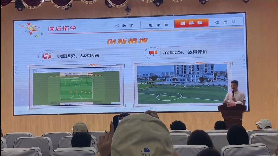 再者由蔡万首老师进行《足球三点包抄战术》说课展示,蔡老师先以娴熟的足球技艺吸引在场体育老师的眼球。他以信息技术为媒介,通过信息技术与课堂教学的融合,清楚明了展示足球三点包抄战术,从而提高教学质量,赢得在场体育老师的热烈掌声。