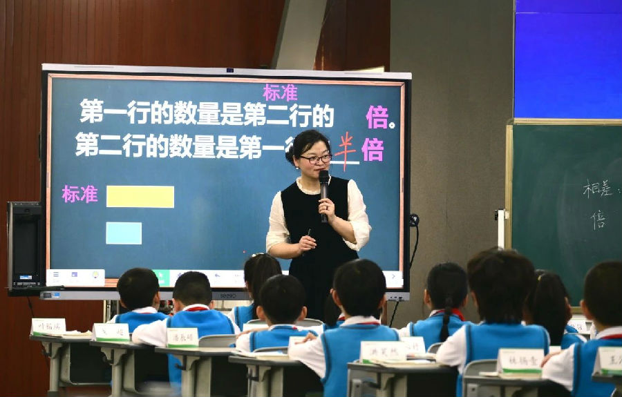 第二节课,高级教师、舟山第一小学副校长周莹老师执教《两个数量的关系》。孩子们经历了从用“比多”“比少”表示两个数量的关系,再到用“倍”来表示两个数量之间的关系。整节课周老师反复运用黄圆和蓝圆数量的比较,不断变式通过多次对比引导学生总结出了如何确定两个数量的关系。发现无论用哪种方式表达两个量的关系,都需要确定标准,再用另一个量与标准作比较。