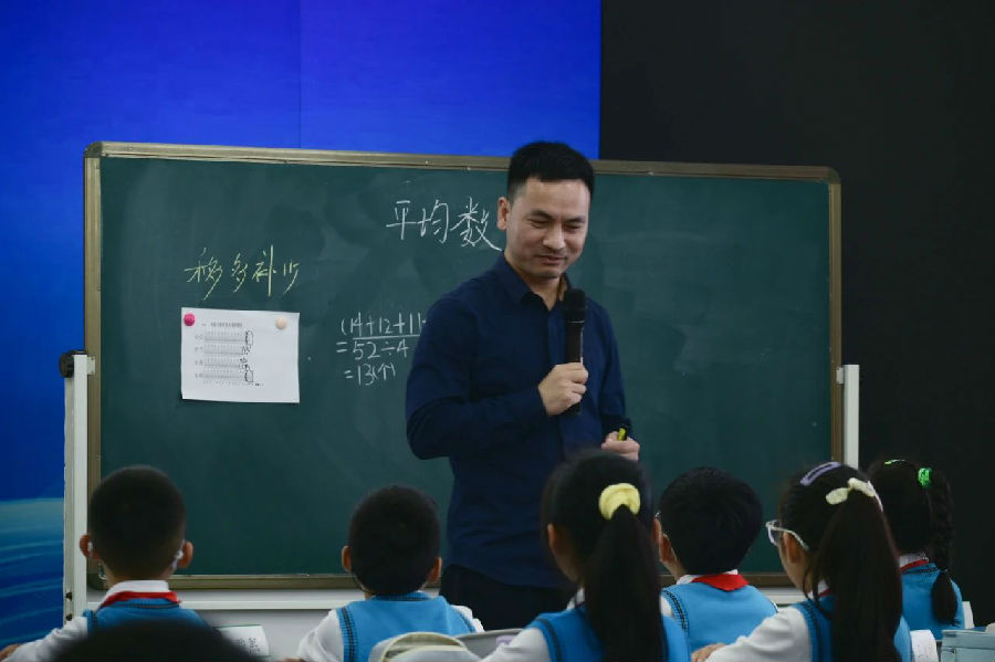 第三节,浙派名师培养人选、绍兴市上虞区实小集团实验小学徐金春老师执教《平均数》一课。课堂现场,徐老师让学生自主经历“移多补少”“先合后分”策略的生成过程,打通前概念与新概念。同时,教师并不满足于“口头文章”,而是独具匠心地利用课件动态再现了“先合并,再等分”的过程画面,直观强化了二年级“平均分”知识与四年级“平均数”知识之间的本质关联。徐老师重视“平均数能反映什么”这一学习难点的有效突破,强调概念学习的思辨味,帮助学生建立对“平均数是一个虚拟的数,反映一组数据的整体水平”概念的切实感悟。“哪个池塘比较危险”的话题讨论将平均数知识“埋伏”进现实场景中,使得学生需要应用所学、灵动思考,进一步丰富了其对平均数本质功能的深度认同。