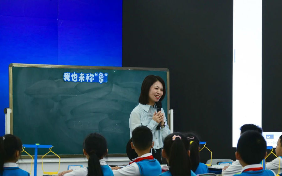 第二节课,浙江省教坛新秀、温州市名教师、苍南县站前小学吴小姿老师执教《我也来称象》。吴老师从语文课本中的《曹冲称象》故事出发,让学生通过模仿实验,感受两个物体重量之间的等量关系,进一步引导分析出称“象”的方法是通过将不能直接测量的量转化成可以测量的量。随后,学生小组合作,设计研究方案并操作记录,解决一枚回形针的质量是多少的问题。在这一过程中,学生经历方案制订、讨论、修改,小组合作、动手实践的过程,建立多枚回形针质量与已知克数物品质量之间的等量关系,最后通过计算得出结果。本节课吴老师向学生渗透转化的数学思想,引导学生将不能直接测量质量的物品与可以直接测量质量的物品建立等量关系,形成解题策略。课后以“还可以称什么?”拓展课堂活动,深化模型思想,提高学生解决此类问题的能力。