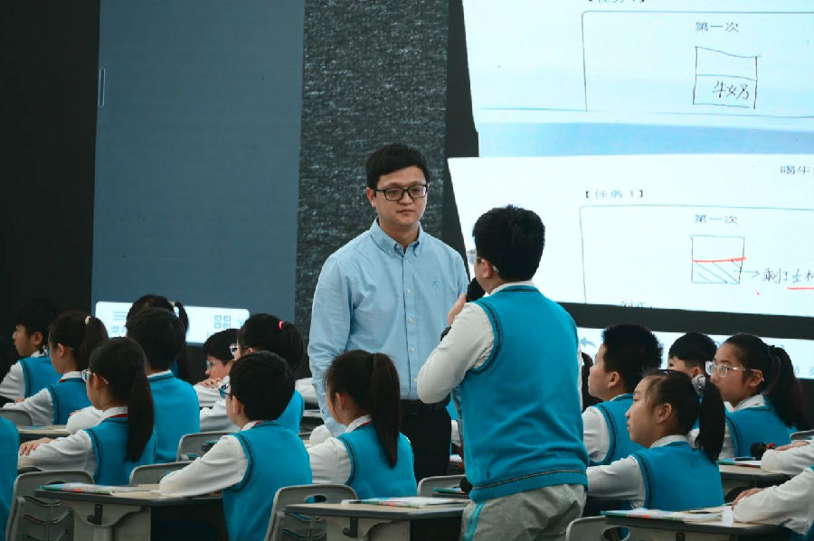 10日上午第一节课,温州市教坛新秀、瑞安市实验小学蔡展老师执教《喝牛奶问题》。蔡老师指导学生用简洁的图清晰地表达题意信息,从牛奶和水的“混合”,到人为的“分离”,问题解决的策略突显而简洁。牛奶和水的变与不变,一清二白。
