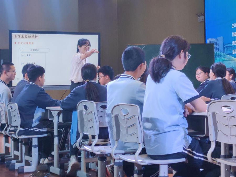 第三节《单音与和声》课堂导入独树一帜,来自龙湾区实验中学吴加琦老师通过热身游戏并提问“为何能拍得整齐响亮”,让学生形象感知个人遵守集体规则的重要性。紧接着过渡到研学活动策划,在与学校研学规则(征求意见稿)的对比中,出示个人意愿与集体规则发生冲突时合理化解的微项目活动,学生全程参与,基于自身情况提出可行性建议。明其理,行其道。吴老师以研学活动串联本课,将说理转向内在体验,使学生逐步形成并强化坚守集体主义的意识。