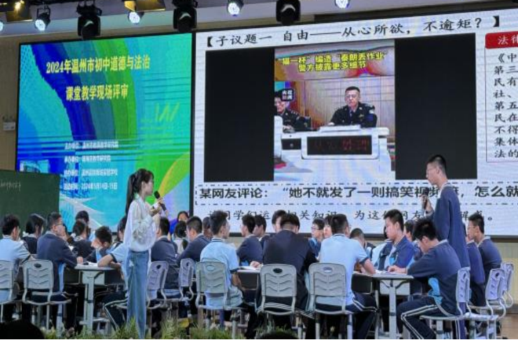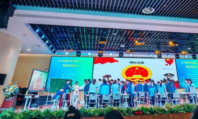 最后,由温州市第四中学的朱赛娜老师带来课堂展示《公平与正义的守护》。朱老师以《今日说法》胡阿弟境外代购案作为课堂讨论的案例,引发学生思考:公正之心,如何坚守?并通过模拟法庭辩论的形式,学生的思维被激活,潜能被激发,让他们知道,不管站在哪一方,都要有公正之心,司法建设在不断的推进当中。同时,在公正的审判中,让学生感受到生命和法律的平衡点。最后,朱老师给学生布置了一项项目化作业:在我们的生活中也有可能会遇到这样一些情法冲突事例。如:我的好朋友欺凌他人,我该怎么办?结合本课所形成的法治思维,开展小组辩论并形成报告。整堂课,学生的主导性和主体性充分发挥,教师的引导作用得到充分肯定。