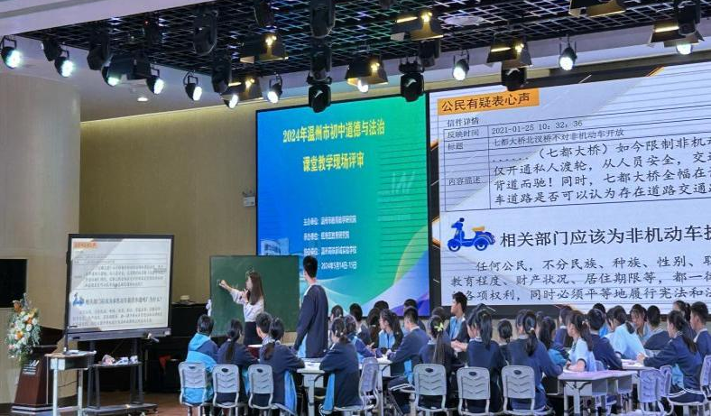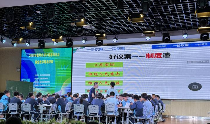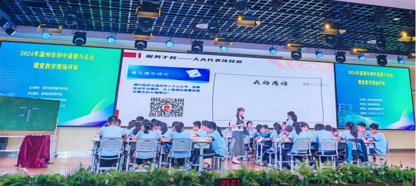 温州市高铁新城实验学校的陈怡老师带来课堂展示《根本政治制度》。陈怡老师充分发挥了学生的积极主动性,展示了他们的项目化作业成果——走近身边的人大代表。学生们通过采访身边的人大代表,更深入地了解了人大代表的产生、职权、义务以及如何与选民保持密切联系。通过思维导图的形式让学生更好地了解人民代表大会制度的内容。最后,针对学校门口交通拥堵的问题,通过小组合作,在线给人大代表联络站提建议。通过这种方式,让学生对我国的根本政治制度有了更好的理解。整堂课老师娓娓道来,学生的参与度很高。