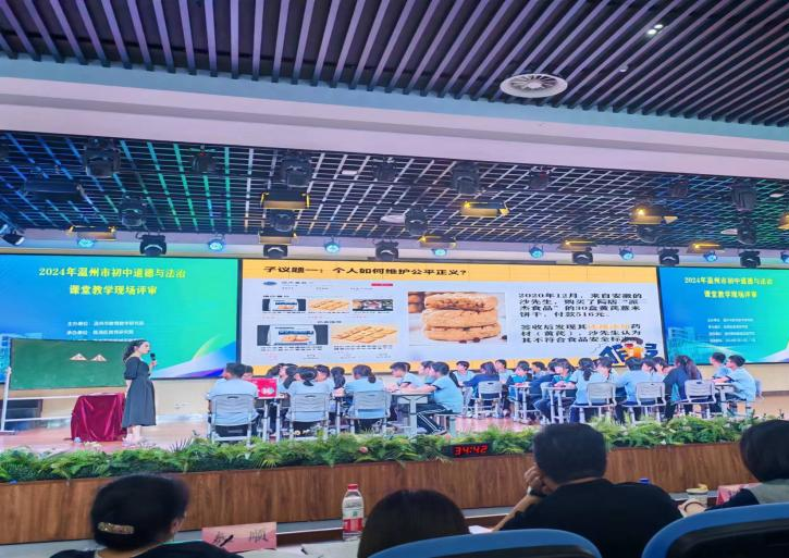 在5月15日下午场的课堂评比中,温州市洞头区海峡中学王倩倩老师带来课堂展示《公平与正义的守护》。王倩倩老师以案例“沙先生购买黄芪薏米饼干后发现商品违规添加药材后继而再次大量购买该商品并要求退款并支付10倍赔偿,遭到拒绝后,将涉事食品公司告上法庭”贯穿全课,让学生讨论个人应如何守护公平正义,司法如何守护公平正义。学生们积极参与讨论并说出自己的看法。最后王老师让学生们分享自己亲身经历过的不公平的事例,谈谈自己的看法和建议。整堂课思路清晰,学生积极性高。