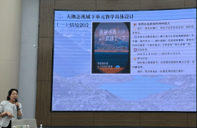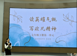 蔡安琪老师以《读英雄气概,写非凡精神——七(下)第一单元整理课》拉开分享序幕。蔡老师从三方面对教学设计进行阐述:目标的制定、学习过程及我的反思总结。如何制定目标?蔡老师以《新课标》为依据,要求学生理清思路、理解分析主要内容、体会重要词句在语言环境中的意义,从而能对作品中的感人情境和形象说出个人体验。学习过程上,蔡老师基于单元特质、教材要求及学习分析确定了单元大概念,并依托于本单元学习目的“写出人物精神”,分解单元知识概念,创设驱动任务:“如何制作公众号来宣传家乡的名人”。最后,蔡老师立足于《新课程》中的文化自信、语言运动、思维能力和审美创造四个方面进行复盘反思。