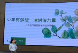 周白雪老师分享的是《少年有梦想,演讲传力量——八(下)第四单元整理课》。周老师通过单元教材的编排和教材任务的解读,发现单元其实依循着一条“阅读为基础、探究为内核、由读到写、再到演讲实践”的逻辑,于是依据演讲词的主要特点,让学生通过对比阅读,深入理解演讲词的针对性、条理性、感染性。教学环节中,学生可以通过模拟演讲、自我反思、主题演讲等活动,撰写出一份有听众意识、观点明确、富有感染力的演讲词。周老师的教学设计从把握演讲特性到撰写演讲稿,初步进行了知识读写能力的结构整合,使学生对于演讲体系有了更深入的了解。