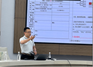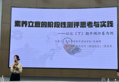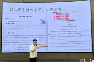 活动的第二环节,是由温州市瓯海区郭溪中学的廖苏苏老师和温州外国语学校娄桥分校的朱楠霸老师为我们带来的命题心得分享。他们强调命题要锚定教材,关注学生。《新课标》中指出,”评价的目的是为了考察学生实现课程目标的程度,检验和改进学生的学习和教师的教学、改善课程设计、完善教学过程。”所以,当前的考试命题可以反作用于教学样态,必须深入思考情境是否必须、是否适切、是否促进学习。随后,两位老师以样卷为例,深入分析“教学评一致”在命题中的体现。分享命题意图旨在通过测评卷指向学生的学习内容、学习过程和学习结果,让学生运用好文本,在理解中运用,在运用中提升,关注阅读者从文本中应得的阅读收益,调动高阶思维,来解决阅读中实实在在的问题。在分享中,工作室主持人张寰宇老师亦强调:命题要多去实践,不用一味地赶时髦、学潮流,而要以教材为本,从学生角度出发,真正把握命题本质。