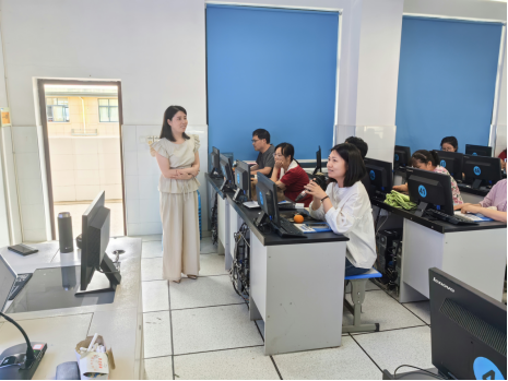 林志辉老师以点、线、圆为基本元素,通过对这些元素的变换、构造、度量、计算、动画等,让老师们熟悉工具栏和快捷键的使用。针对每个知识点,结合教学实践具体案例,林老师要求老师们在电脑进行实际操作,构造出课堂中常见的组合图形和动态图。在林老师深入浅出,幽默风趣的讲解下,老师们感受到了几何画板强大的教学应用功能与魅力。老师们虚心学习、认真操作,已经能够借助几何画板制作一些简单的教学课件。