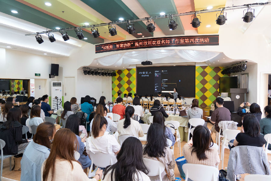 《基础教育课程改革纲要(试行)》提出:“充分发挥信息技术的优势,为学生的学习和发展提供丰富多彩的教育环境和有力的学习工具。”为进一步推动幼儿园课程改革,提升幼儿园教师AI数智赋能教育教学的实施能力,打通工作室之间的一种界域,形成一种开放式的学习场域,实现教育资源共融共享。2024年5月17日我们在文成县实验幼儿园开展温州市刘双双名师工作室第二期第四次线下活动。