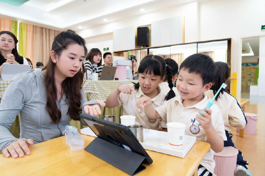 孙琳琳老师通过AR互动,让幼儿感受牙菌斑对牙齿的影响,了解保护牙齿的方法,借助智能互动刷牙游戏,激发积极主动、正确刷牙的意愿。信息技术的融合,不但提升幼儿课堂参与度,还提高教育教学效率。