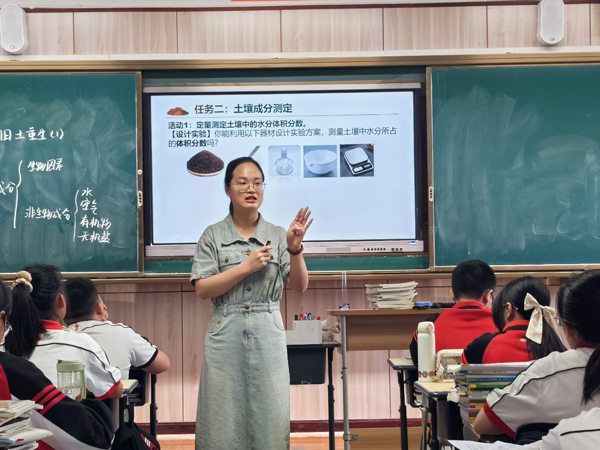 温州市双屿中学胡嘉雯执教研讨课《土壤的成分》。胡老师以枯萎植物盆栽为引子,引导学生关注问题土壤,并明确核心任务为改良土壤品质,从而开展对土壤的成分的深入研究。胡老师从土壤生物推理出非生物成分,指导学生设计论证土壤成分,培养证据意识。胡老师注重科学思维和探究实践,让学生利用器材测定土壤成分,通过设计、实验、交流评价等过程提升能力。整节课由易到难,重点突出,学生在知识与技能学习中提升科学思维。