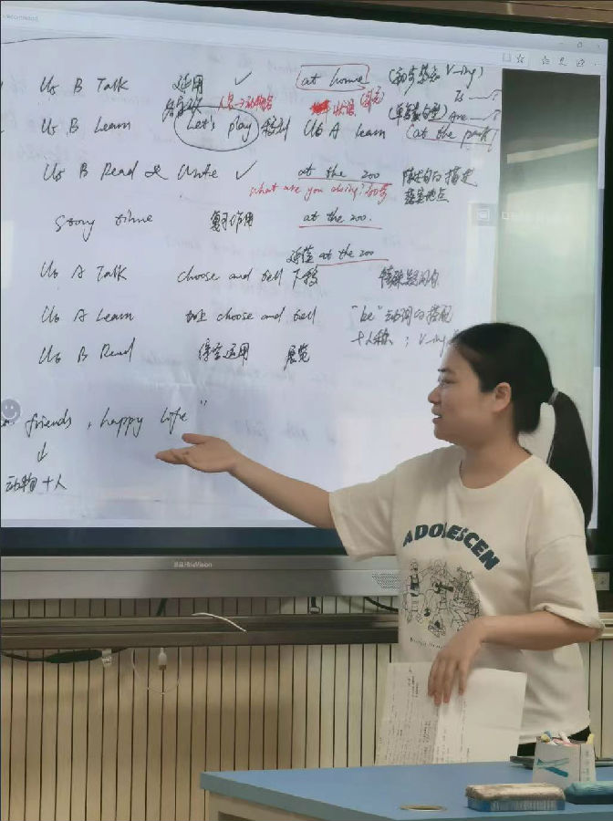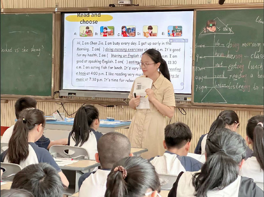 第二节课是来由灵溪镇第一小学李思思老师带来的PEP6 Unit6 A Let's Learn。李老师的课堂非常扎实,首先是通过复习动词现在分词的变化规则,再以“Chen Jie’s Day”为主线,关联活动的时间轴逐步学习本课重点词汇。通过读一读、选一选、想一想、说一说等不同的方式呈现本课新词,并落实到学生书写。李老师结合学生实际水平,采用扎实的教学方式,真正落实到孩子新知的学习。