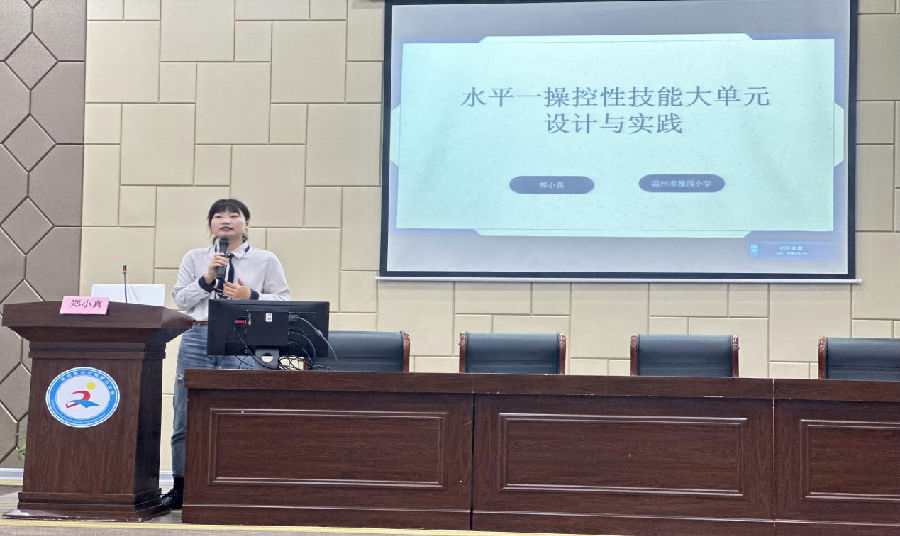 温州市籒园小学的郑小真老师带来《低段操控性技能大单元设计与实践》,郑老师从基本运动技能的内涵、分类、发展规律、理论模型-动作发展模型多维度进行了详细介绍。结合新课标下基本运动技能的课程内容、水平目标、学业要求做具体阐述。同时以水平一阶段操控性技能:小篮球游戏活动进行的单元整体设计为例,进行更深一步的分析,让与会的老师能更加直观的对操控性技能大单元的设计和实施有了更深层次的理解。
