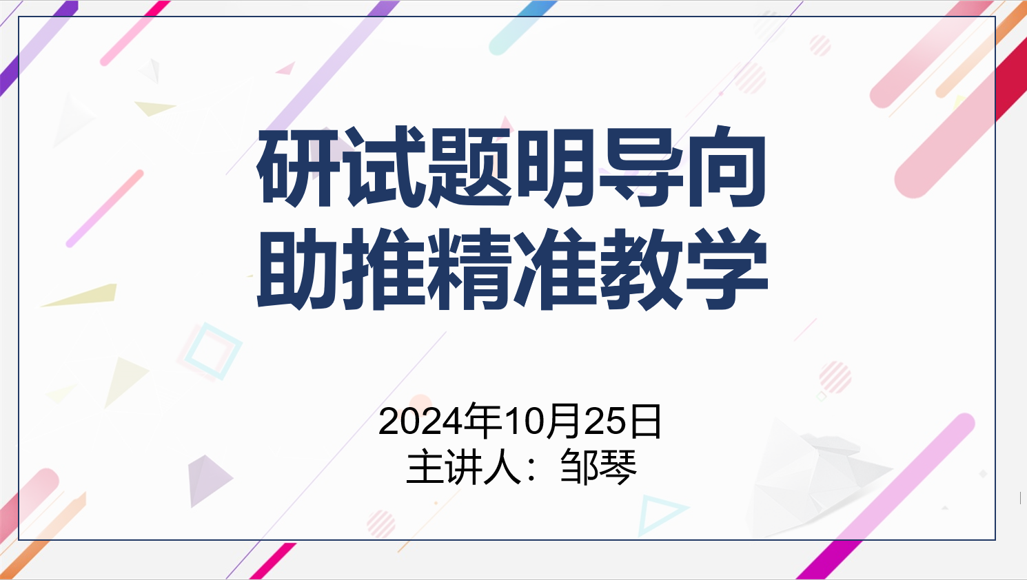 正高级讲师邹琴老师则以《研试题明导向,助推精准教学》为题,结合自己多年的任教经验,分析了当前教育考试的趋势与特点,深入探讨了试题背后所蕴含的教学导向。她通过具体的案例剖析,指出教师应如何从试题中洞察学生的学习需求和薄弱环节,以便更好地调整教学策略,实现精准教学。同时,邹琴老师还分享了自己在教学实践中总结出的有效方法和技巧,为广大教师提供了宝贵的借鉴和参考。