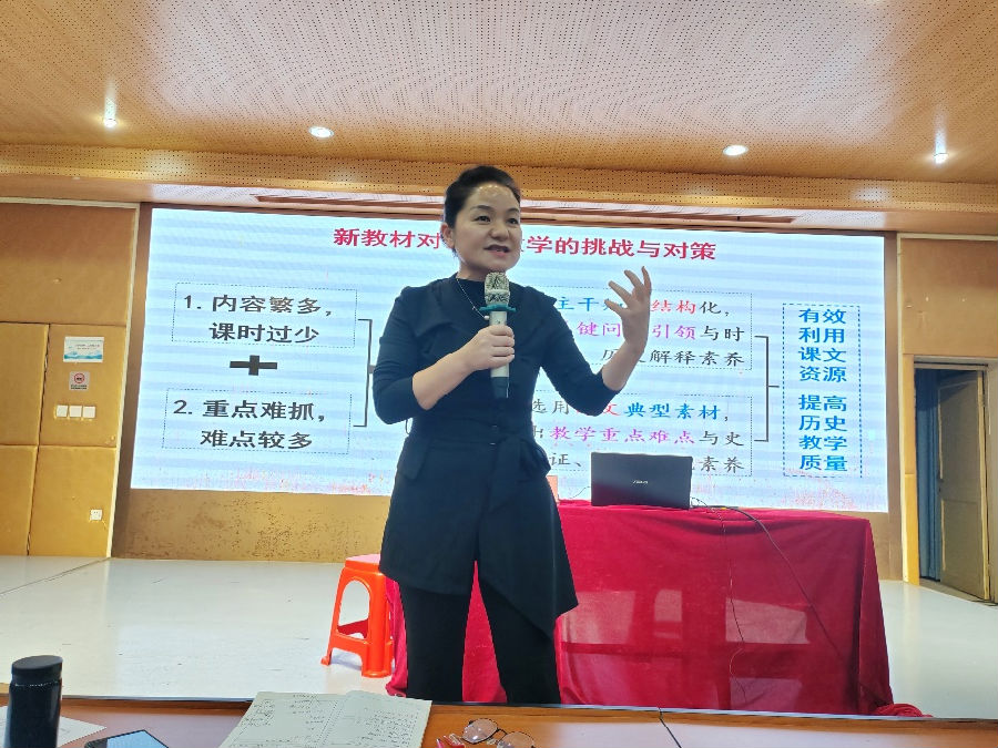 这次活动专门邀请浙江师范大学教育学院教授郑流爱教授,研究方向为中学历史课程改革和教师教育为我们做了关于新中考,新教材的讲座。郑教授将2024年社会法治中考题和2022新课标相结合,以《秦末农民起义》为例,对于如何制定教学目标、对教材进行逻辑化梳理等问题进行详细的指导。针对内容繁多、课时过少,重点难抓、难点较多的历史教学问题,郑教授指出,一定要有效利用资源,提高历史教学质量,并给出两点建议:①将主干知识结构化,突出关键问题引领与时空观念、历史解释素养。②选用课文典型素材,突出教学重点难点与史料实证、唯物史观素养。