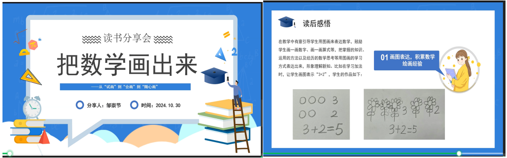 邹崇节老师分享了刘善娜的《把数学画出来》。此书巧妙地将数学知识与绘画相结合,助力学生更好地掌握数学知识。邹崇节老师希望通过分享,能够鼓励教师们将这一创新教学方法应用于实际教学中,以激发学生对数学的兴趣与热情。