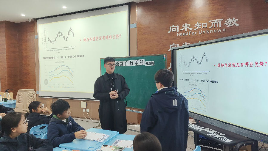 20日上午,首先由工作室学员姜嘉骥老师执教公开课:《体温的控制》,姜老师以小明一家人去露营过夜为情境,围绕“失温“急救,任务导向、合作探究。姜老师用”氢氧化钠固体溶于水放热“模拟补充食物获得能量;用”相同的热水流过粗、细橡皮管后温度不同“模拟血管粗、细散热快慢不同。环环相扣,科学严谨。