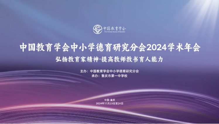 为深入学习贯彻党的二十届三中全会和全国教育大会精神,落实立德树人根本任务,助力教育强国建设,11月23日-24日,以“弘扬教育家精神·提高教师教书育人能力”为主题的中国教育学会中小学德育研究分会2024年学术年会在重庆市第一中学校召开。2023级温州市孙有新“名师送教”工作室主持人孙有新、导师项延唐参加了此次盛会。