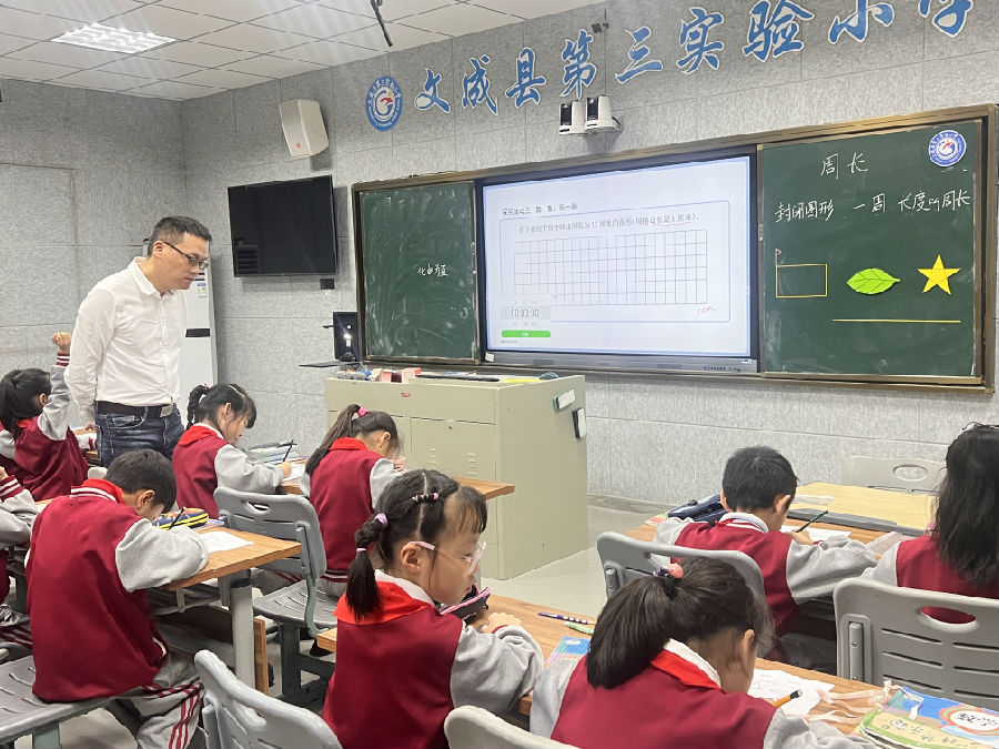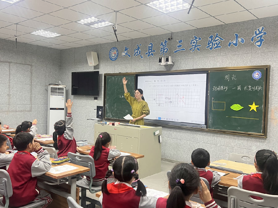 活动伊始,文成县第三实验小学的苏畅老师和三年级(2)班同学一起探究《周长的认识》,课的开始苏老师通过让学生充分感知面与周的区别,摸图形、摸数学书的封面等等。从面中剥离出线,直观、量化图形的周长,根据边的特征选择合适的累加策略。儿童对“面”的感知是显性的,对“周”的感知是内隐的。苏老师直面儿童的认知难点,不回避本来本节课内容不涉及的强势要素的“面”,努力凸现出弱势要素的“周”。老师着重让孩子们感知周长,通过撕图形一周的绳子,让学生知道一周是要从起点开始回到起点,突破了本节课的重难点。