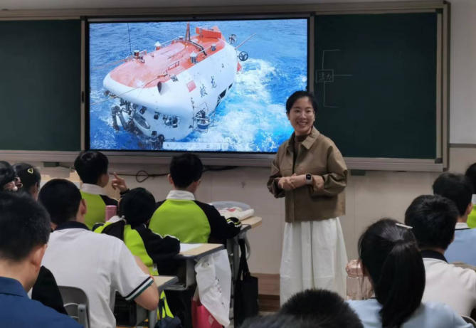 林娴静老师展示课堂《“蛟龙探海”浮力复习课》,林老师通过蛟龙号引入课堂,首先通过外观展示尺寸,并引导学生进行简单计算,给学生复习了阿基米德原理。然后以如何实现蛟龙号的下沉、上浮等问题,引导学生回顾了物体的浮沉条件,接着在任务三中,通过以资料卡的形式给出蛟龙号以及“向阳红09”的一些新闻报道,引导学生去分析船体在多运动过程中收到的浮力大小变化以及船体的上浮和下沉,灵活结合了前面两个任务的知识点。引发学生思考。最后让学生通过画图的形式表示蛟龙号浮力以及绳缆拉力随着深度的变化关系。并引导学生通过计算,改进所画的图像。
