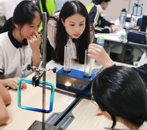 董盈盈老师展示课堂《大气层》,她以一个“神奇的风车”为引入,激发了学生的学习兴趣。并以探究“风车的奥秘为”驱动,引导学生先以液体即水的流动为切入点,组织学生完成第一个探究实验:往液体对流演示器种滴入色素,并用酒精灯加热左下角,通过观察实验现象,得出水对流的规律。通过流体类比,第二个探究实验利用了空气对流演示装置,将蜡烛点燃左下管,观察线香的烟的方向进而得出空气对流的规律。两个实验中董老师都自行演示在装置对应部位喷上制冷剂喷雾的效果,使得课堂的气氛异常活跃,实验后董老师总结了对流规律。然后通过科学史并展示大气温度的变化规律,引导学生对大气层进行分层。进而讲解各个大气层的特点。