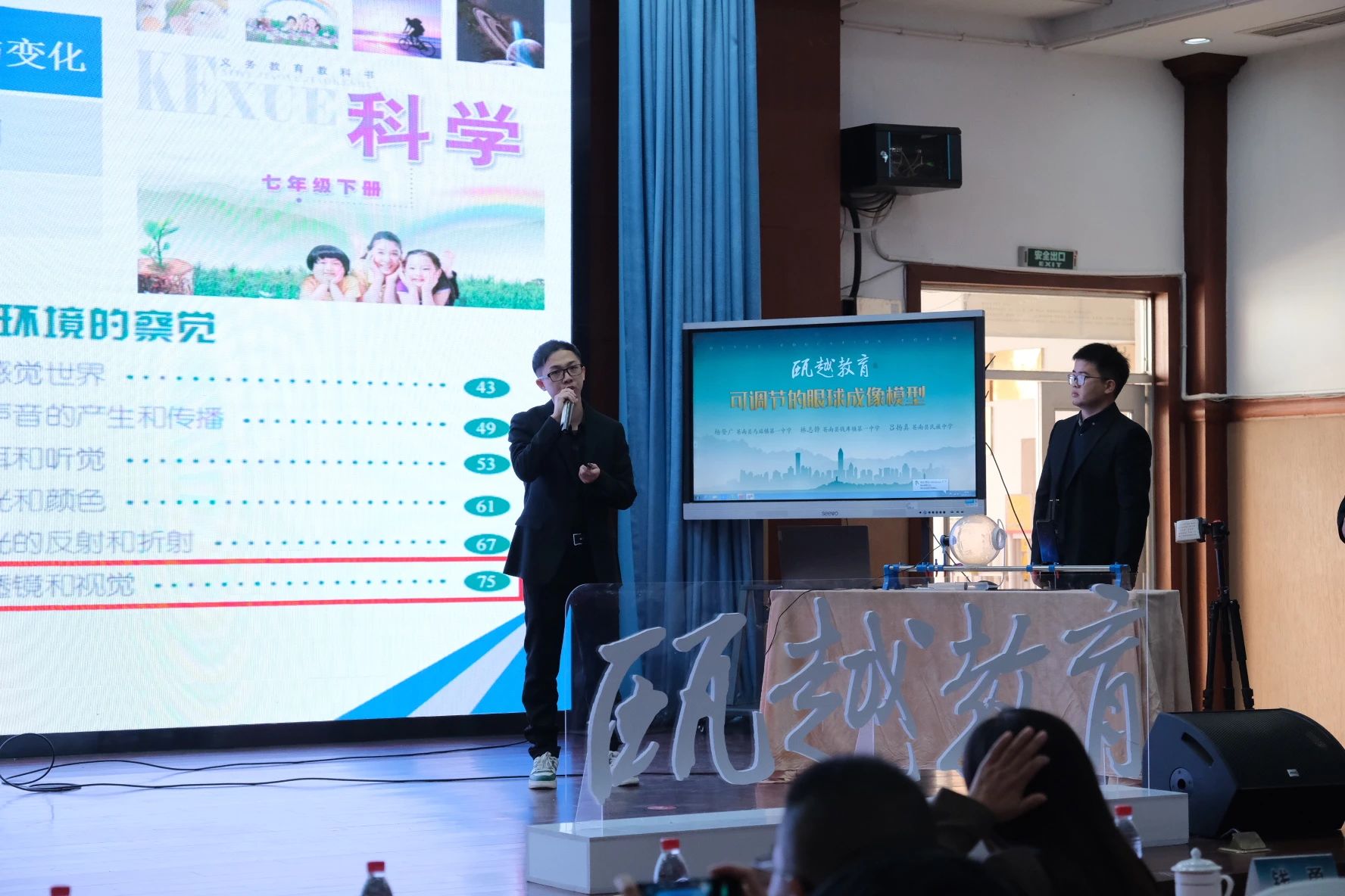 什么把生活变成工程?什么把科学难题转化为探索和成长的阶梯?成果展示现场,来自四个县(市、区)的科学教师团队带来工程实践应用展示。从生活入手,关注声音、关注近视、关注低头族;从身边的材料入手,棉线、尼龙绳、塑料桶等一一用上。“自制小乐器”“水钟”“可调节的眼球成像模型”“人体中的杠杆”,每一个项目都在实践教学中经历了不断的迭代更新,让学生像工程师一样,动手实践、不断探索,切实提升探究能力,从而感悟科学魅力。